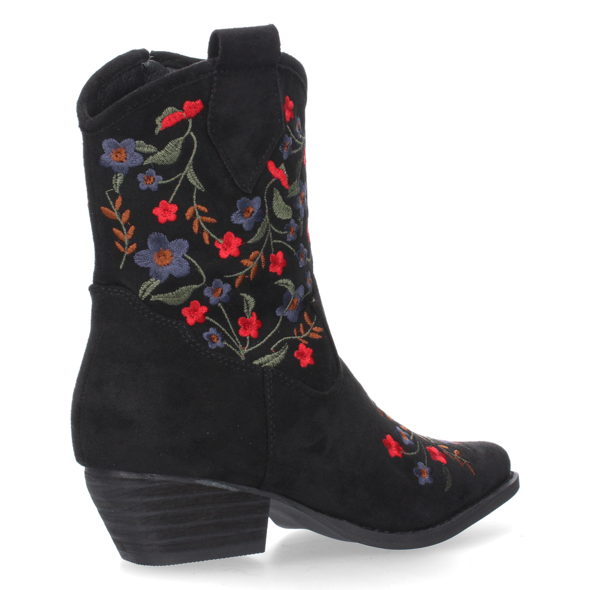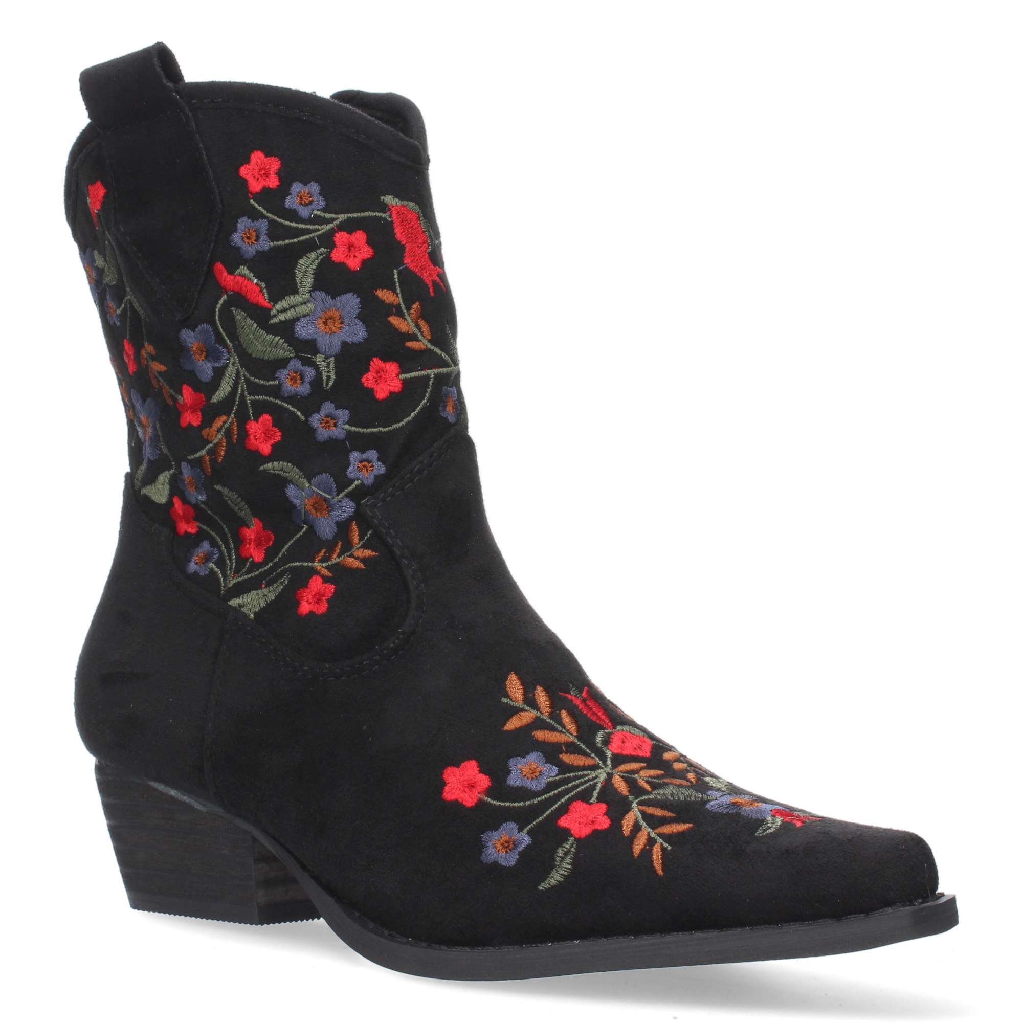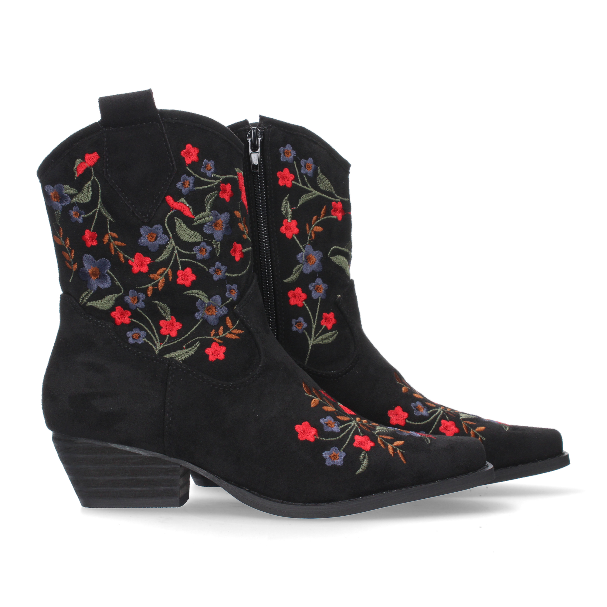 Botin de tacon comodo para mujer con estampado de flores en la ca?a y en la pala.